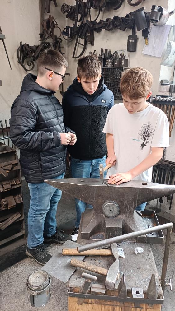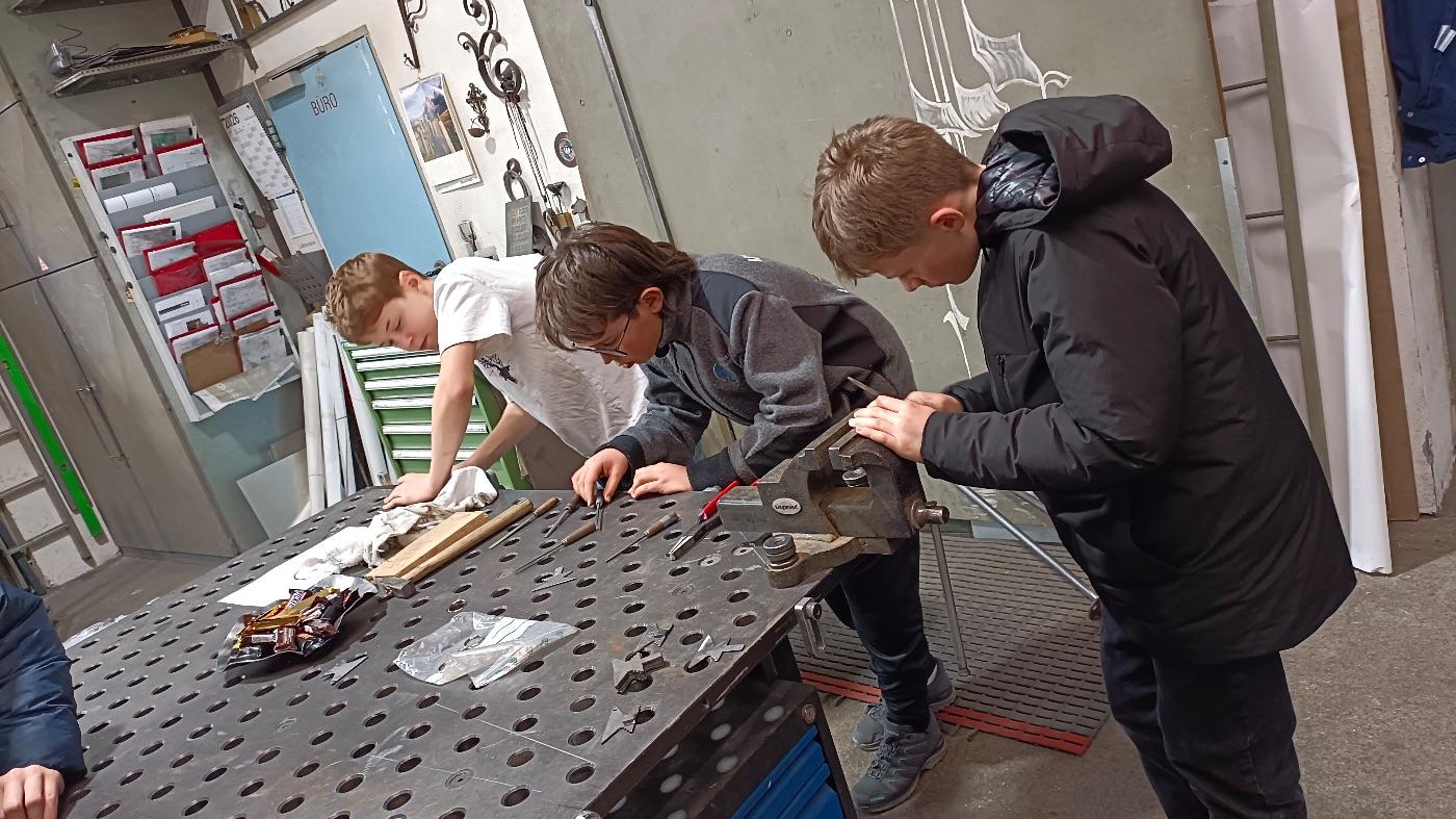 Dort erhielten die Schüler:innen spannende Einblicke in die Welt der Metallbearbeitung. Zu Beginn wurden wir durch die Werkstätte geführt und lernten verschiedene Arbeitsabläufe kennen. Anschließend durften die Schüler:innen selbst aktiv werden: Metall wurde in der Schmiedeesse erhitzt und anschließend mit Hämmern in Form gebracht.